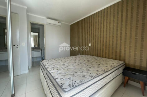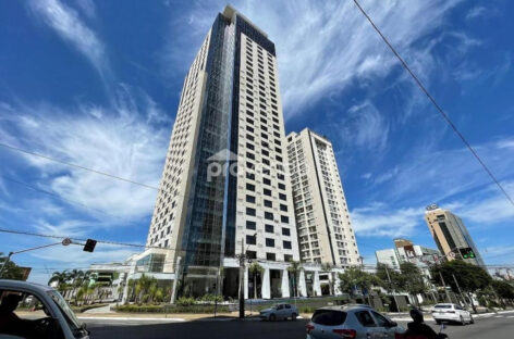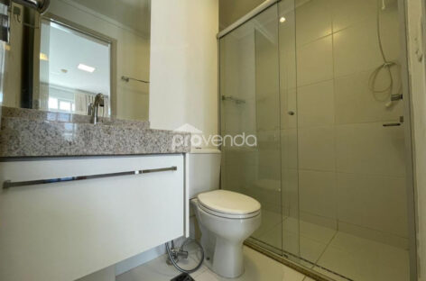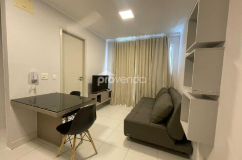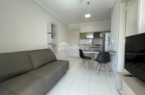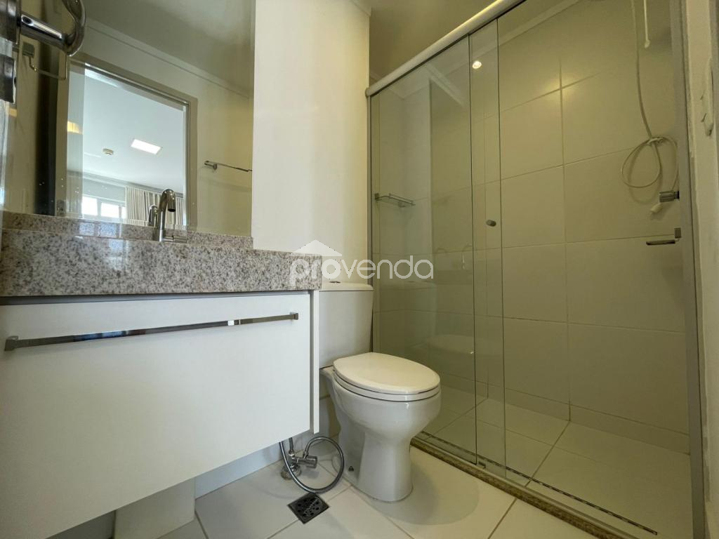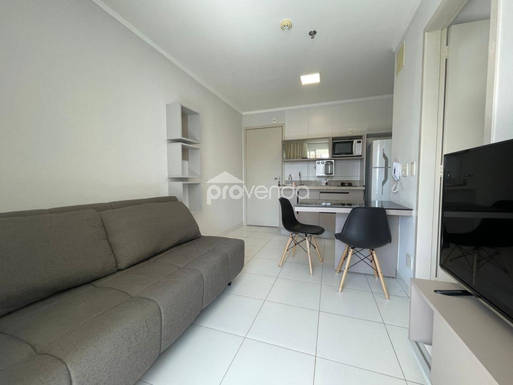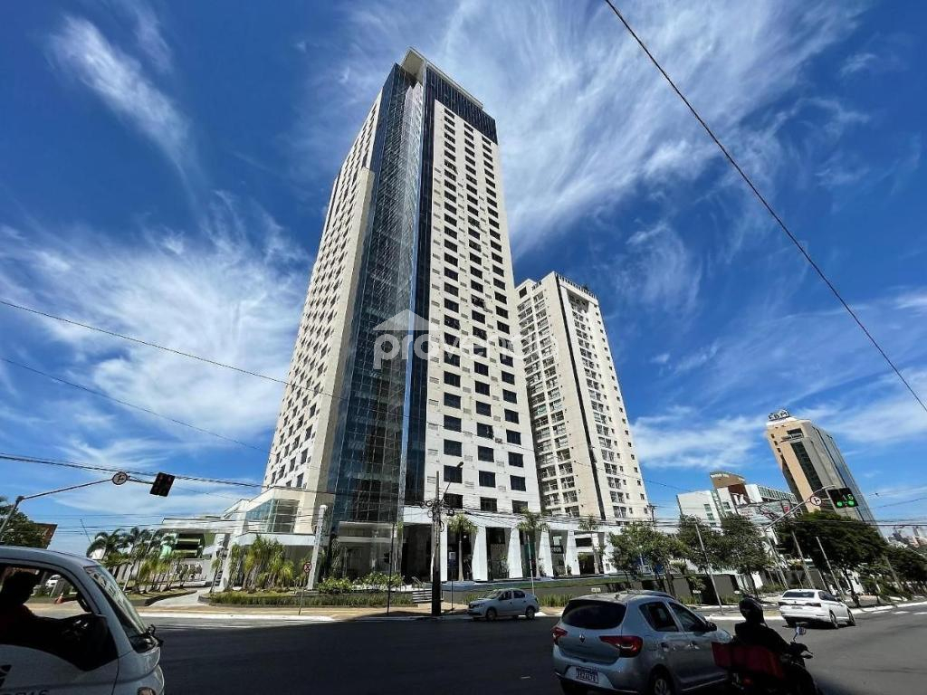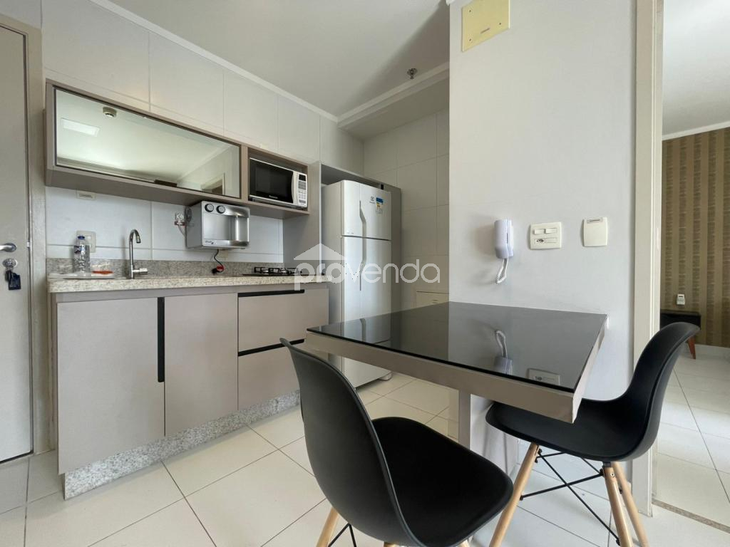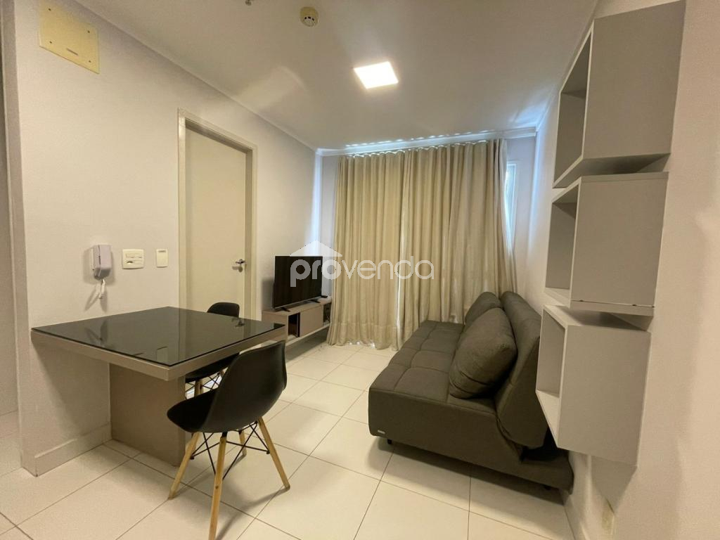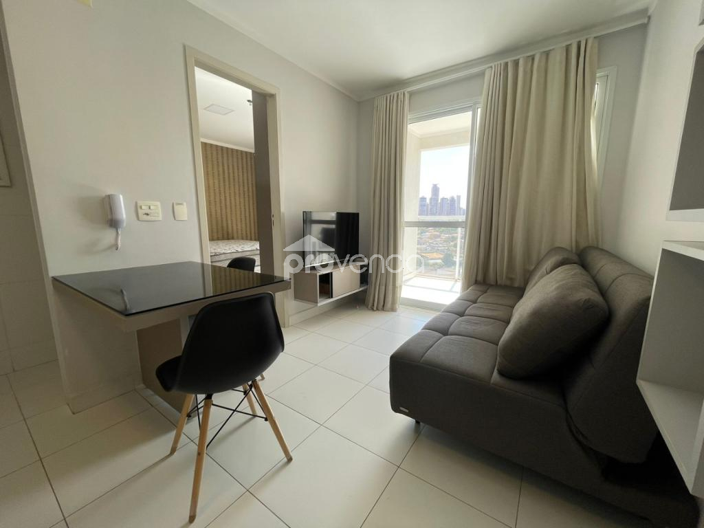 Apartamento para aluguel com 1 suíte com armário, cama e ar-condicionado, banheiro com armários, sala com sofá, rack com tv, mesa com cadeiras, sacada com mesa e cadeiras, cozinha com armários, fogão, micro-ondas e geladeira e 1 vaga de garagem, no Condomínio Metropolitan Business & Lifestyle, Jardim Goiás.