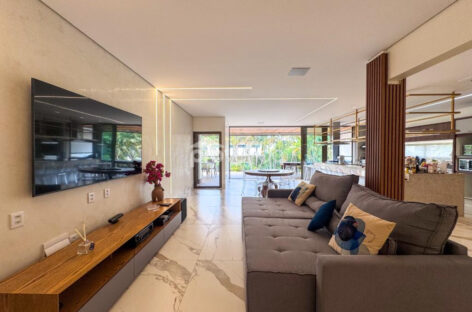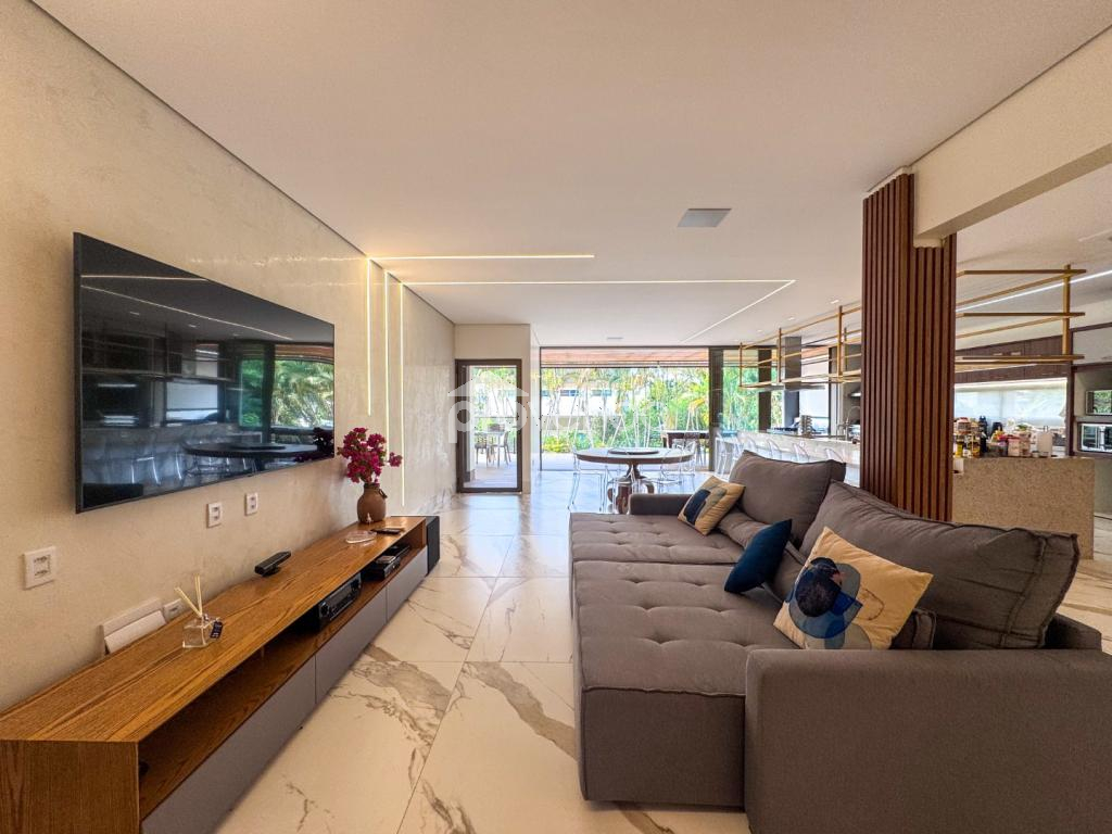Sala ampla e reformada, com integração fluida entre estar, jantar e home cinema