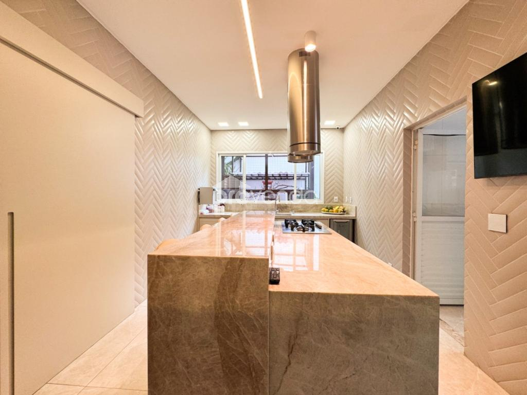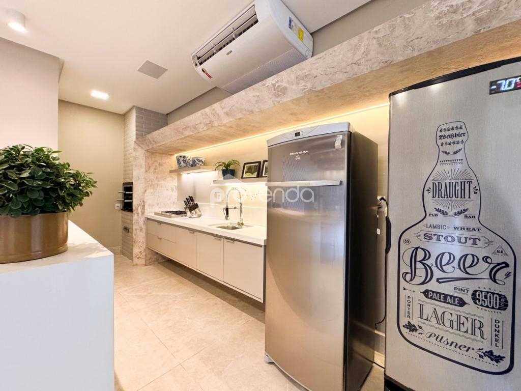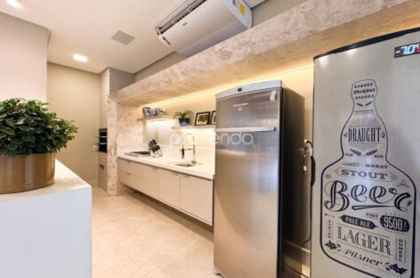 Varanda gourmet completa com cozinha e churrasqueira a carvão